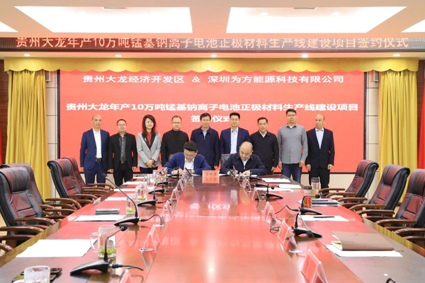 近日,为方能源与贵州大龙经济开发区管理委员会签约年产10万吨锰基钠离子电池材料生产线建设项目。