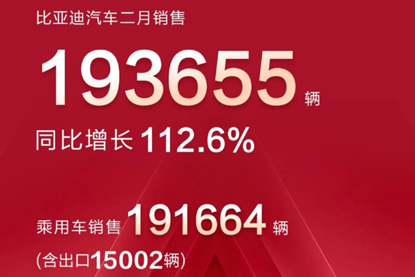 比亚迪2月新能源汽车销量193,655辆,同比增长112.6%。至此,比亚迪新能源汽车累计销量超370万辆。