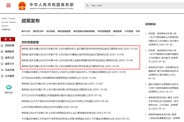 第55号、56号、57号、58号公告是两部门发布的对涉及超硬材料、部分稀土设备和原辅料、锂电池和人造石墨负极材料、部分中重稀...