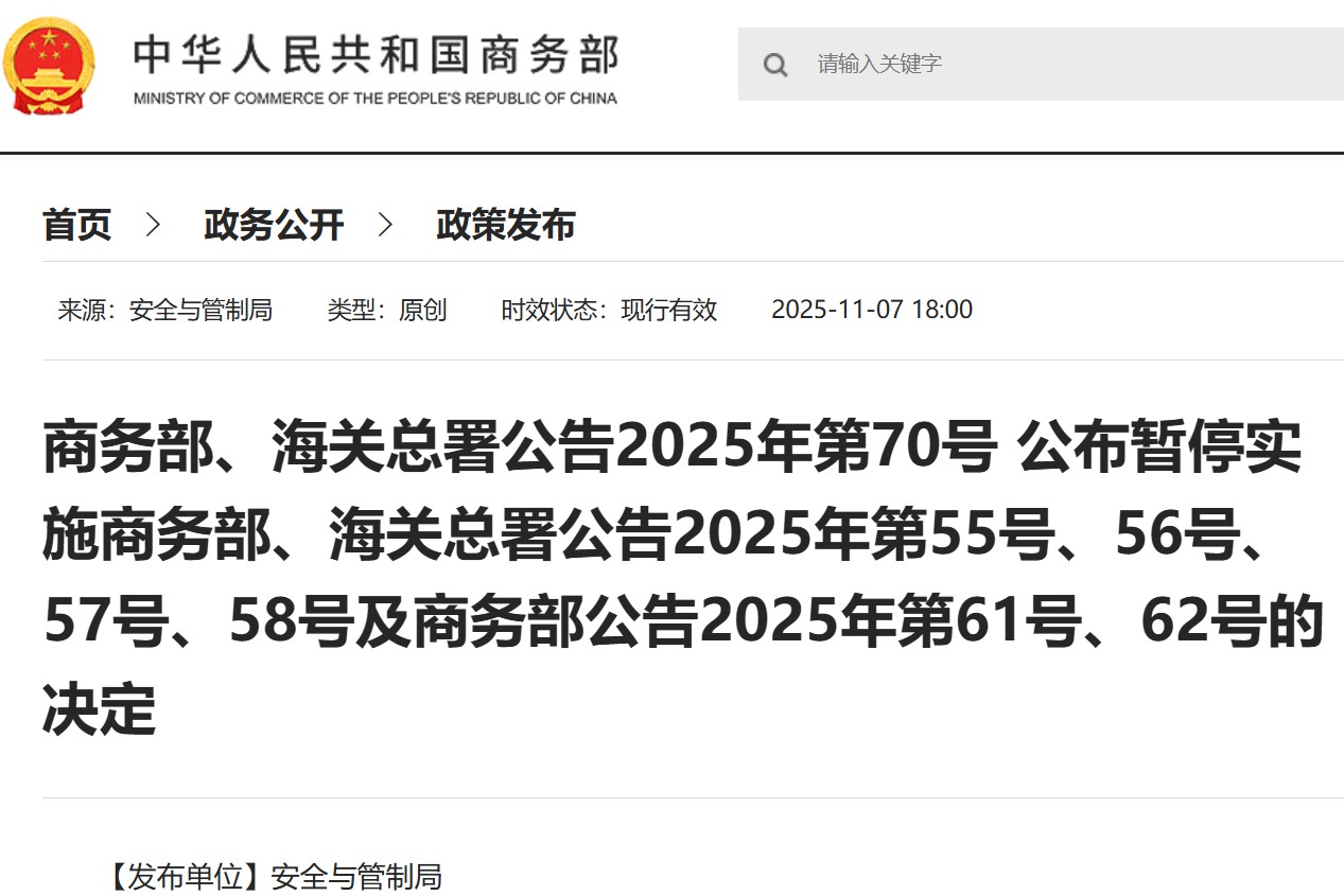 本公告自2025年11月8日起正式实施。《中华人民共和国两用物项出口管制清单》同步予以更新。