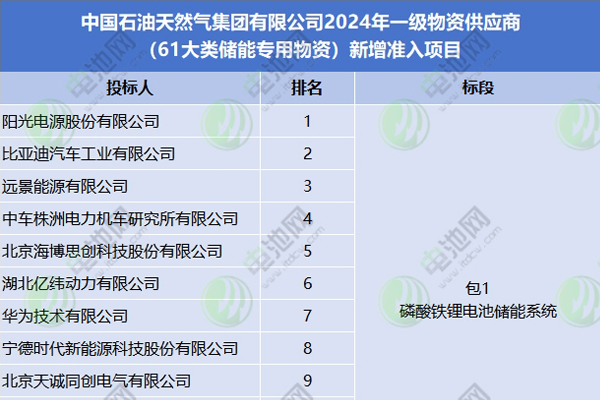 中国石油发布2024年一级物资供应商(61大类储能专用物资)新增准入项目中标候选人,共有22家储能企业进入,包括的物资有磷酸...