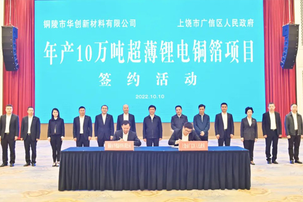 10月10日,华创新材年产10万吨超薄锂电铜箔项目签约活动在江西上饶广信区举行,该项目总投资为百亿级。