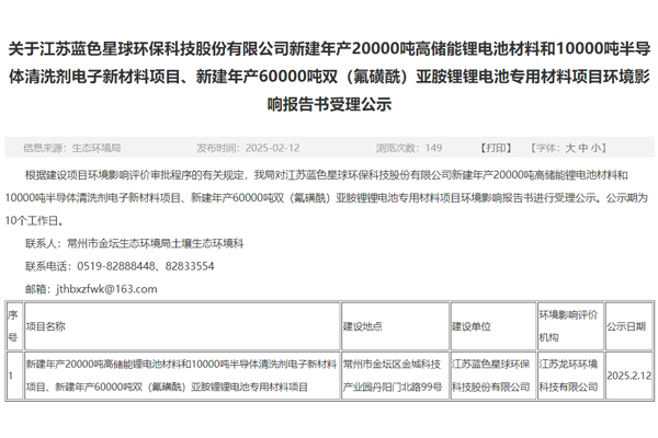 江苏蓝色星球环保科技股份有限公司拟投资109,000万元,在现有厂区内实施“新建年产20,000吨高储能锂电池材料和10,0...