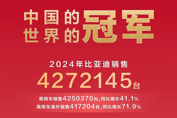 2024年,比亚迪蝉联三大销冠:中国汽车市场车企销量冠军、中国汽车市场品牌销量冠军、全球新能源车市场销量冠军!