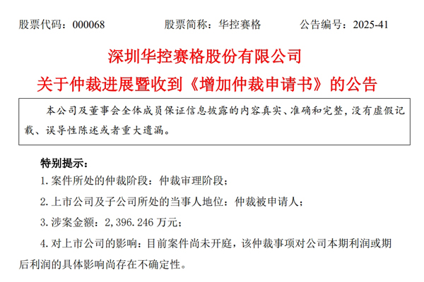 华控赛格公告,黑龙江省七台河市新兴区人民政府再向七台河仲裁委提交《增加仲裁申请书》,索赔总额增至2396.25万元。
