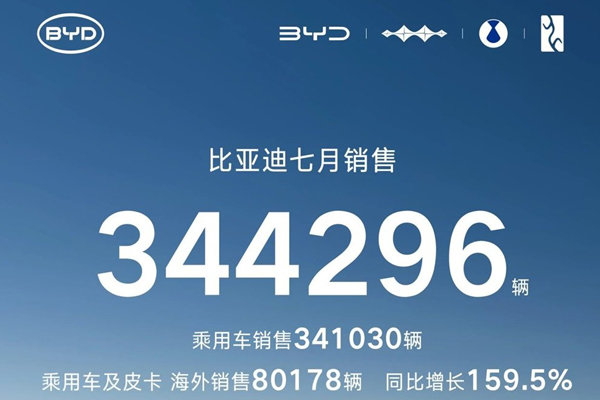 7月比亚迪新能源汽车销量34.43万辆;1-7月累计销量为249.03万辆。截至目前,比亚迪新能源累计销量已超1300万辆。