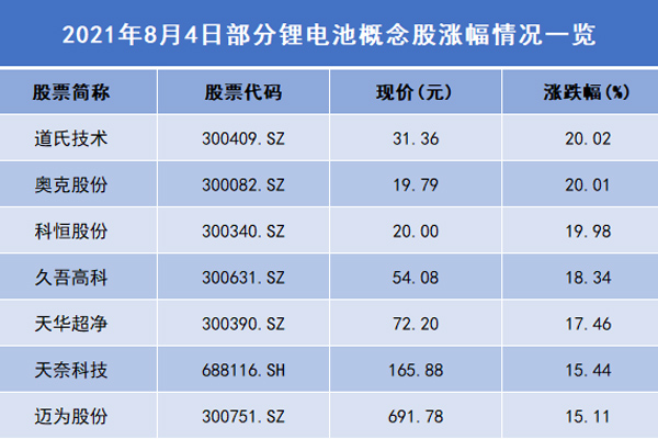 8月4日收盘,锂电池板块上演涨停潮,逾100只概念股涨幅超5%,其中,逾45只概念股涨停。在涨停的概念股中,道氏技术、奥克股...