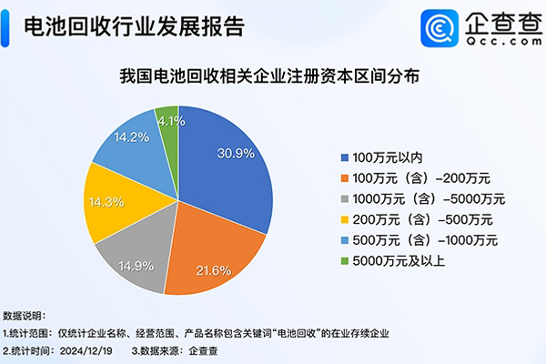 我国现存16.2万家电池回收相关企业,以小型企业为主,注册资本在200万元以内的企业占比52.5%。